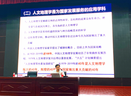 會議伊始,方創琳以人文地理的基本概念及領域應用方面為切入點展開報告,再對人文地理學的內容做出系統概述后,方創琳從人文地理學的學科屬性方面做出闡釋說明,重點向同學們表示人文地理學并不是簡單的“理論的排列”,而是一門真正應用于日常實踐和人類生產生活的“應用類”學科。隨后,方創琳提出隨著國家建設、國土規劃趨向專業化,人文地理學的發展和研究更具有時代意義。他表示,未來發展人文地理的趨勢應該是聯系更多學科、應用更多手段,才能使人文地理學的研究進一步壯大。并在此向同學們發出號召,人文地理學從“任務驅動”學科到真正形成“于個體相對獨立、于全局與其它學科密切聯系”的“應用類”學科還需要同學們的進一步努力和耕耘。最后,他勉勵大家一定要珍惜時間、拓寬眼界,未來以扎實的學科本領投身新時代的地理學學科建設。