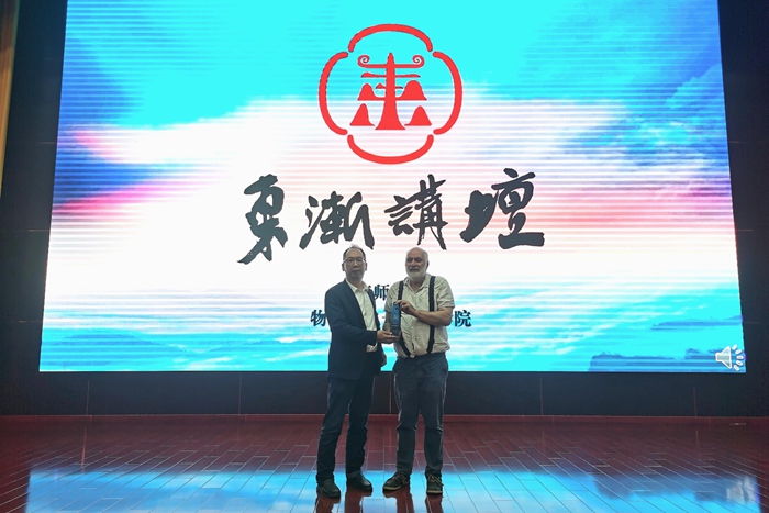 近日,物理與電子科學學院第19期“東漸講壇”第36講在長清湖校區樹蕙堂報告廳舉行。本次“東漸講壇”特別邀請英國皇家工程院院士Somekh Michael Geoffrey教授作報告。副校長、物電學院院長蔡陽健出席活動并向嘉賓頒發“東漸講壇”獎杯。歐洲科學院院士、教育部長江學者特聘教授、深圳大學講席教授袁小聰,之江實驗室馮甫教授受邀出席,物理與電子科學學院領導、相關專業教師、研究生和本科生300余人參加活動。長江學者講席特聘教授Taco Dirk Visser主持報告會。