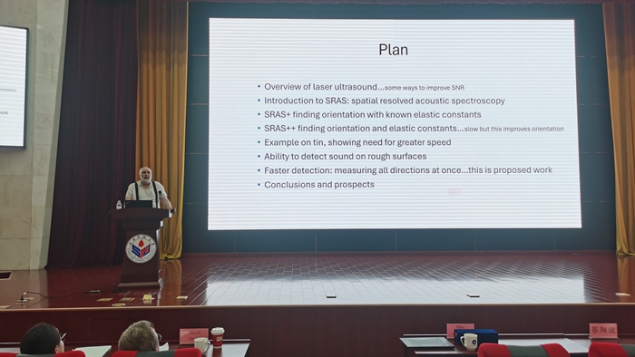 Somekh Michael Geoffrey作題為《Quantitative Laser Ultrasonics》(《后期定量超聲學》)的學術報告。他概述了激光超聲波在顆粒和材料紋理成像研究領域的應用原理,闡明了激光超聲波的優缺點,并進一步介紹了該領域的最新研究成果?;跍y量材料的晶粒取向和彈性性質的可能性,Somekh Michael Geoffrey給出其紋理和成分信息,并討論了電子背散射衍射技術的應用前景。報告結束后,Somekh Michael Geoffrey教授與部分現場師生進行了交流互動,對師生提出的問題進行了耐心詳細的解答,深化了此次學術交流的廣度與深度。報告受到師生熱烈歡迎。