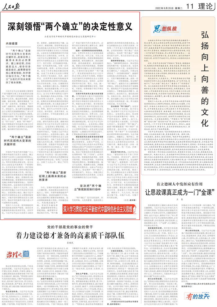 9月20日,《人民日報》11版刊發我校唐洲雁教授理論文章《深刻領悟“兩個確立”的決定性意義》,全文如下: