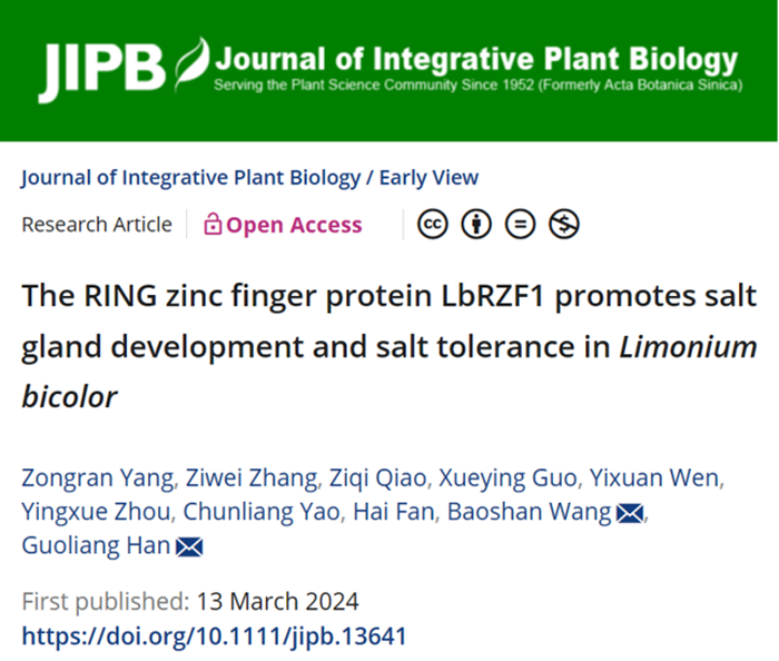 近日,山東師范大學生命科學學院副教授韓國良在植物學領域國際著名期刊Journal of Integrative Plant Biology(影響因子11.4)上發表題為“The RING zinc finger protein LbRZF1 promotes salt gland development and salt tolerance in Limonium bicolor”的研究論文,揭示了RING鋅指蛋白LbRZF1調控二色補血草鹽腺發育和抗鹽的分子機制。山東師范大學為第一署名單位,在讀碩士研究生楊宗燃、張紫薇和已畢業碩士研究生喬梓啟為論文共同第一作者,韓國良和生命科學學院教授王寶山為論文通訊作者。