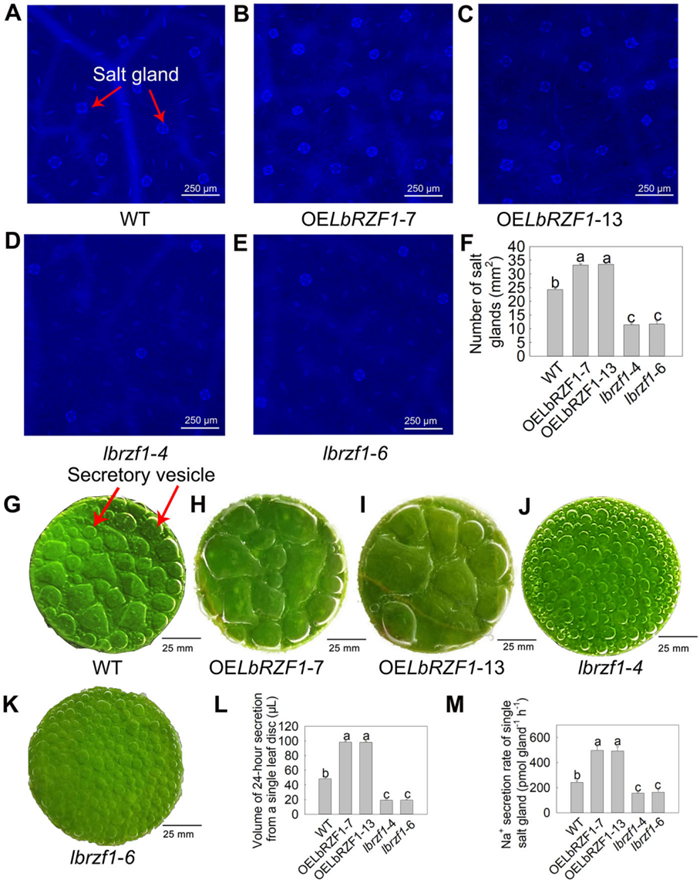 研究發現,LbRZF1屬于二色補血草C3HC4 (RING-HC)型鋅指蛋白,LbRZF1在鹽腺高表達,并受到鹽誘導,經檢測該蛋白沒有E3泛素連接酶活性。實驗發現,LbRZF1正向調控二色補血草鹽腺的發育和抗鹽性。與野生型二色補血草相比,LbRZF1過表達株系中鹽腺數量、泌鹽能力以及整株抗鹽性顯著提高,而突變株系結果相反。體內外實驗發現,LbRZF1分別與LbCAT2和LbMYB113蛋白互作并提高他們的穩定性,從而正向調控鹽腺發育和泌鹽能力,VIGS介導的基因沉默實驗發現LbCAT2和LbMYB113正向調控鹽腺的發育。進一步的研究發現,LbRZF1被上游轉錄因子LbMYB48正向調控,LbMYB48是二色補血草鹽腺發育和泌鹽的正調控因子。LbRZF1在非鹽生植物擬南芥中沒有同源蛋白,將其異源過表擬南芥后,顯著提高了擬南芥的耐鹽性。該研究初步揭示了LbRZF1控制二色補血草鹽腺發育和抗鹽的調控網絡,也為作物改造并提高其抗鹽性奠定了良好的基礎。