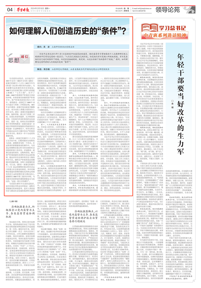 3月18日,《學習時報》04版刊發山東師范大學教授、山東省高校當代中國馬克思主義研究院院長商志曉文章《如何理解人們創造歷史的“條件”?》。全文如下: