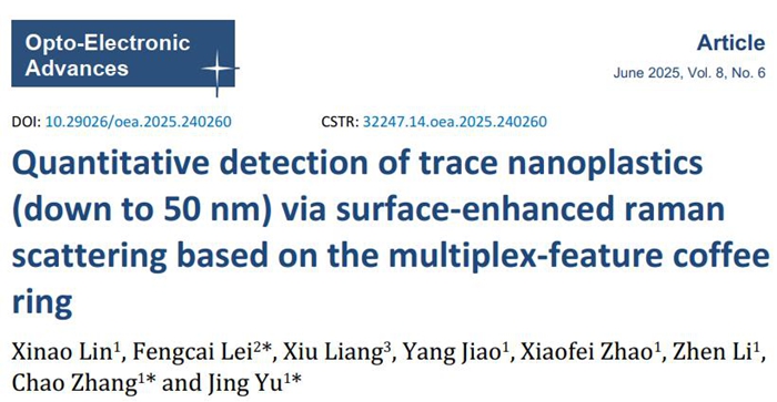近日,滿寶元教授團隊在國際知名期刊《Opto Electronic Advances》(IF=15.3)上發表題為“Quantitative detection of trace nanoplastics (down to 50 nm) via surface-enhanced raman scattering based on the multiplex-feature coffee ring”的研究論文,創新性地提出了一種基于咖啡環效應的多特征納米塑料定量SERS分析方法,為精確檢測水環境中的衡量新污染物提供了一種光譜學方法。