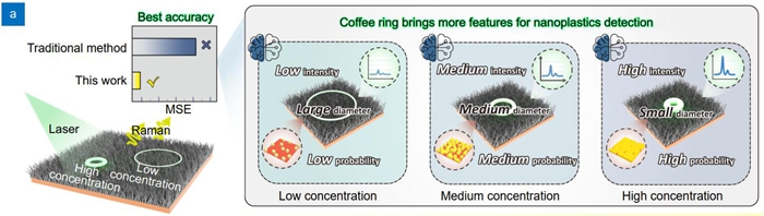 針對這一問題,團隊進一步提出了一種基于咖啡環效應的全新SERS檢測策略。得益于咖啡環的富集作用,即使在納米塑料濃度較低時,也可以在較小的檢測區域內進行拉曼mapping掃描,并收集到較多的有效拉曼光譜信息,且發現檢測區域內的有效拉曼光譜檢出概率與納米塑料的濃度也呈負相關。經探究,研究團隊發現在1 %至10-10 %的濃度范圍內,通過機器學習多特征分析技術得到的納米塑料的濃度測量值與真實值的均方誤差僅為0.54(PLSR)和0.21(SVR),比僅依靠特征峰強度變化的線性回歸分析(4.06)得到的結果提高了19倍,且最低量化檢測限低至10-10 %。該工作有效將SERS技術與浸潤性修飾技術進行了結合,既兼顧了SERS光譜的高靈敏性和指紋特性,同時又克服了超低濃度時拉曼信號強度無法準確反應分析物濃度變化的缺陷,因此具有很強的實用性,對于未來開展精確的納米塑料SERS測量提供了一種全新的思路。
