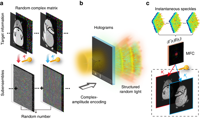 針對這一問題,團隊進一步開創新地提出了非相干復用方案與技術。該方案通過在多路復用的場相關性中安全編碼信息,實現了對傳統相機不可直接探測的隱匿存儲,僅可通過嚴格的統計重建方法予以恢復。受益于隨機波固有的非相干特性,該方法在原理上具備無串擾的優勢,即使在強噪聲背景下亦能保持高保真度。此項工作不僅為光學加密與成像等領域提供了新的技術途徑,同時也為利用聲波、物質波等具有不同物理屬性的隨機波開展信息處理研究提供了重要參考。