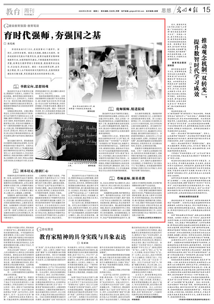 【編者按】9月9日,《光明日報》15版教育周刊“建設教育強國·教育筆談”欄目刊發山東師范大學副校長張茂聰理論文章《育時代強師,夯強國之基》,全文如下: