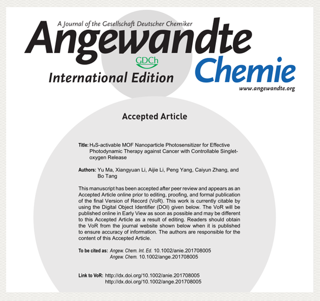 近日,我校唐波教授研究團隊在腫瘤的可控光動力學治療研究方面取得重要進展,研究成果發表在化學領域國際頂級學術期刊《德國應用化學》上(H2S-activable MOF NanoparticlePhotosensitizer for Effective Photodynamic Therapy against Cancer withControllable Singlet-oxygen Release,Angew. Chem. Int.Ed., DOI: 10.1002/anie.201708005,影響因子11.709)。論文共同第一作者為青年教師馬瑜和碩士研究生李向源,通訊作者為唐波教授。