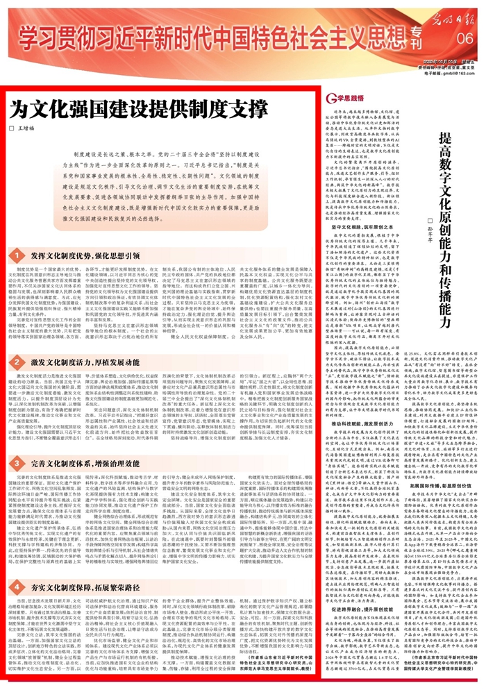 10月10日,《光明日報》06版發表山東師范大學馬克思主義學院王增福教授文章《為文化強國建設提供制度支撐》,全文如下: