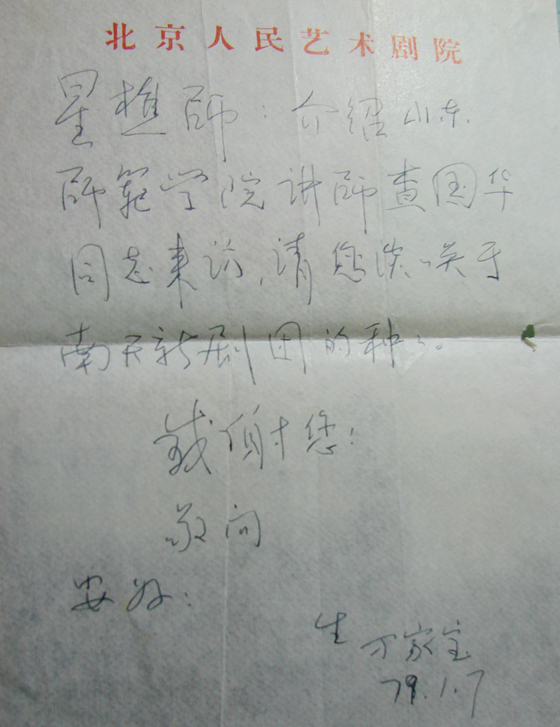 曹禺(萬家寶)先生給查國華先生寫的引薦信