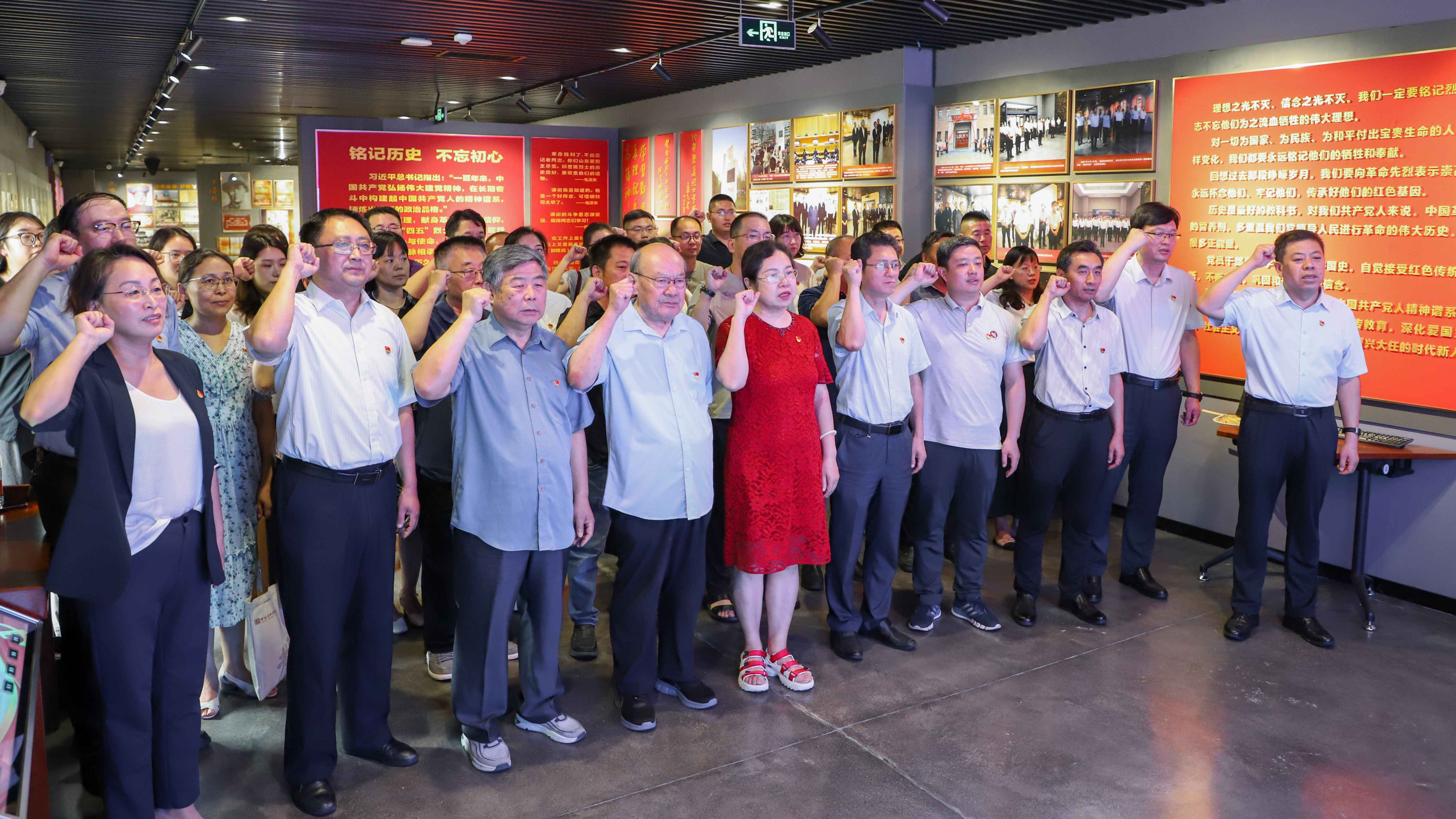 全體黨員依次參觀“星星之火 可以燎原”“浴血奮戰 百折不撓”“追求真理 獻身革命”“銘記歷史 不忘初心”等主題展覽,瞻仰烈士遺物和史料圖片,聆聽鄧恩銘、劉謙初、郭隆真等“四五烈士”的革命經歷和光輝事跡,切身感受到山東早期黨組織發展的崢嶸歲月與波瀾壯闊的斗爭歷程。 參觀結束后,全體黨員面向黨旗重溫入黨誓詞,在莊嚴的誓言中重溫入黨初心。